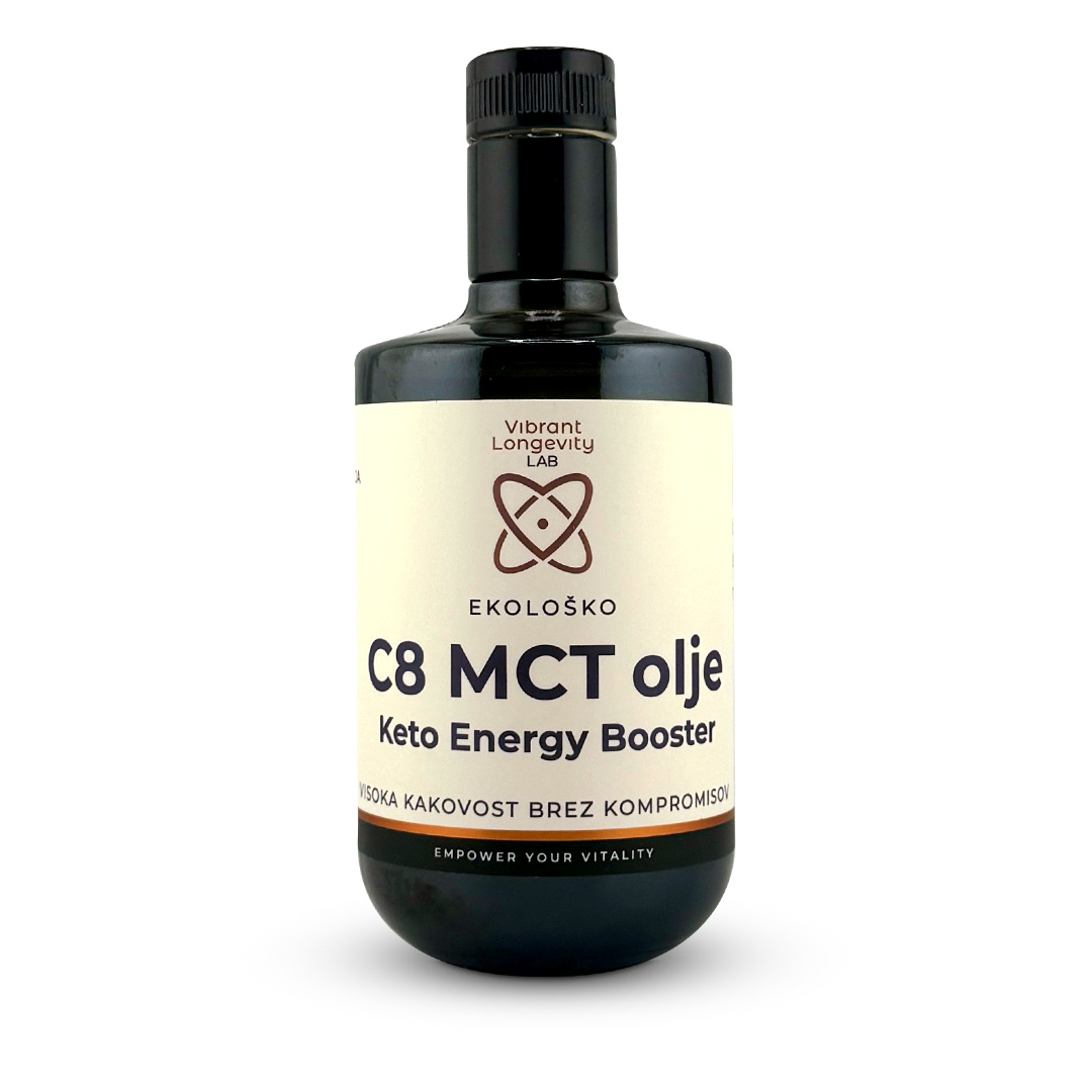 Prehransko dopolnilo Ekološko C8 MCT olje z več kot 98 % čiste kaprilne kisline (C8), pridobljene iz 100 % kokosovega olja. Hitro se pretvori v ketone – naravno prisotne molekule, ki v okviru prehrane služijo kot alternativni vir energije za telo in možgane..